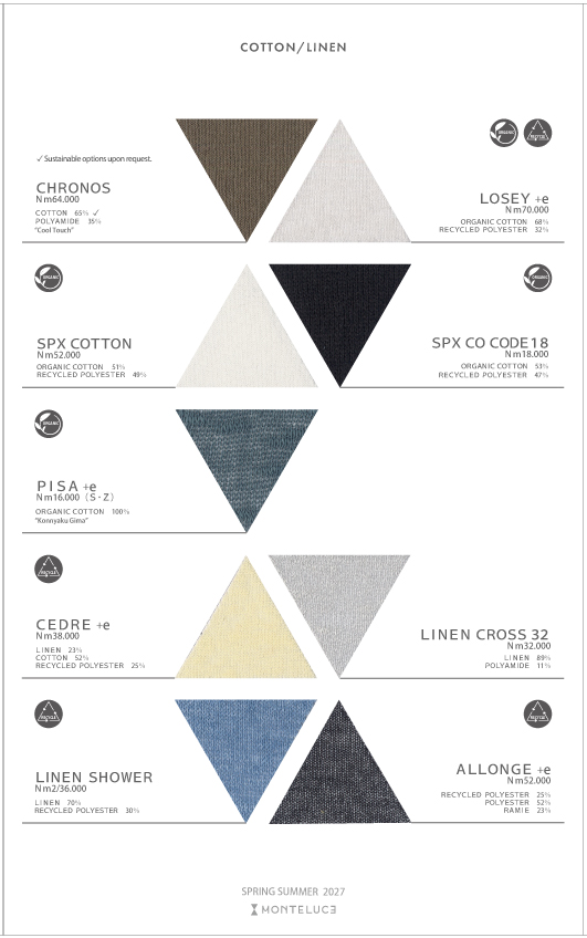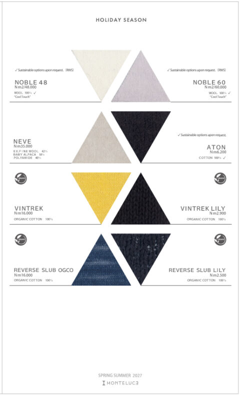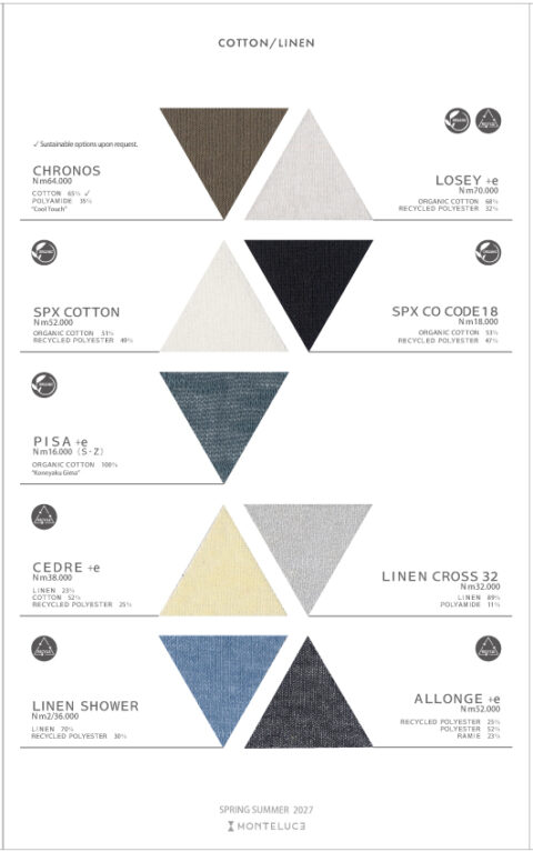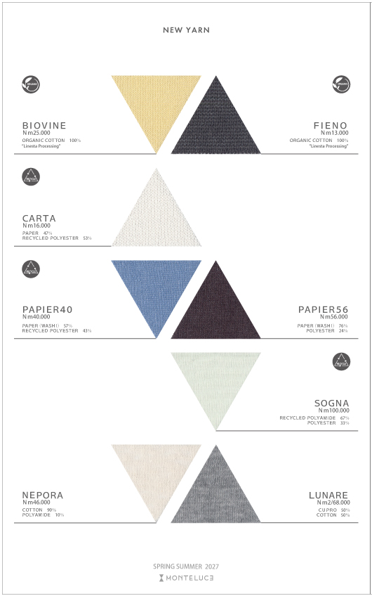 The MONTELUCE 2027 Spring Summer Collection was created under the theme “creating products that are chosen”. Rather than pursuing cost-driven manufacturing, this collection emphasizes the meaning and strengths behind the products we propose. This is reflected in our careful selection of raw materials, the combinations of yarns, the spinning methods, and the specialized processing techniques applied to the yarn.