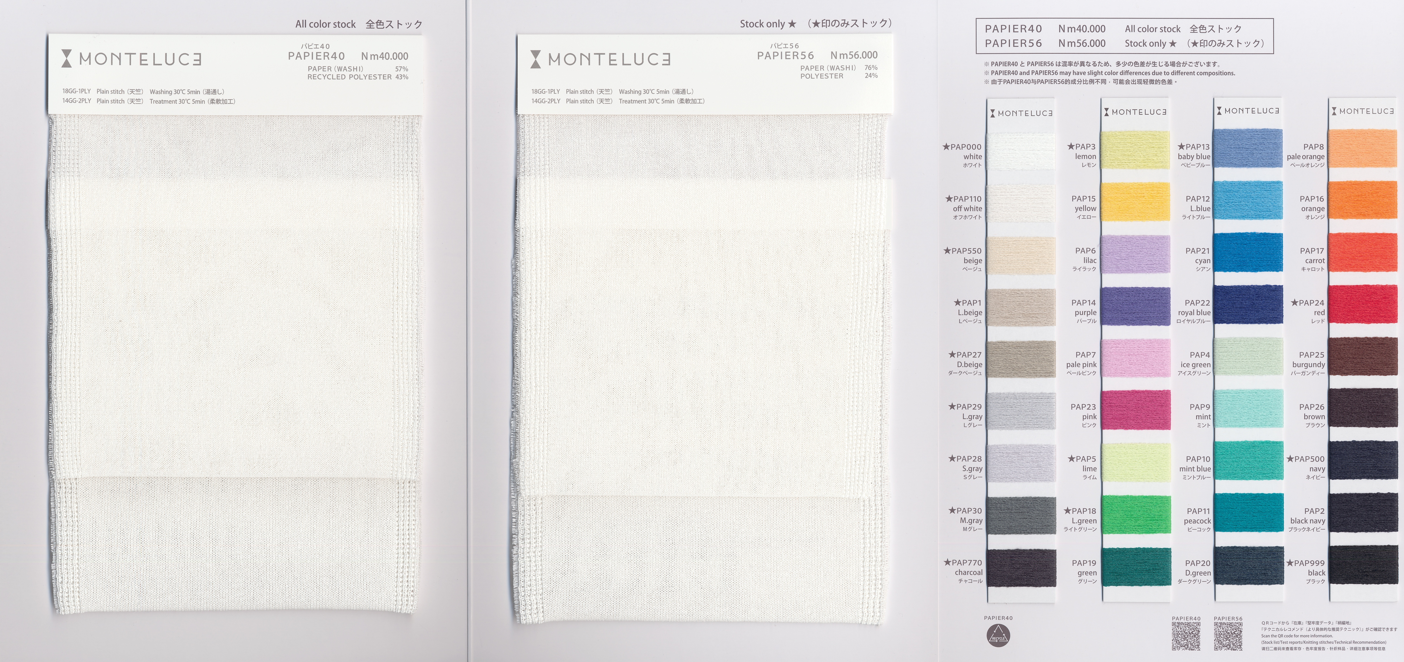 这种和纸被制成极细纱线,再与再生聚酯纤维结合,通过能够一贯完成切割与加捻的专利设备进行生产。凭借这一独特工艺,实现了“强度与伸缩性”“柔软的触感”“易护理性”等特征,同时保持稳定的品质与生产效率。